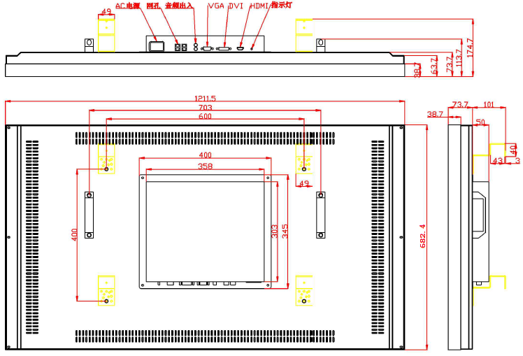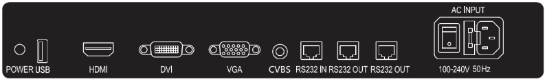 HDMI/DVI/VGA/AV/USB/RS232/ 電源接口 |